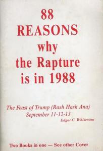 Many other people have unsuccessfully predicted the rapture or the end of the world, including Edgar Whisenant. The former NASA engineer immersed himself in a study of eschatology and published a small book 88 Reasons Why the Rapture Is in 1988. He was so certain of the date between September 11 and 13 that he said, “Only if the Bible is in error am I wrong … I would stake my life on Rosh Hashana 88.”